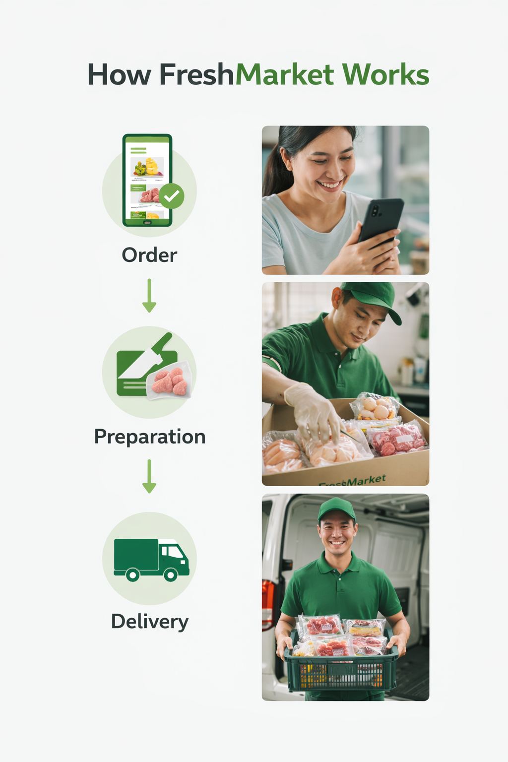 FreshMarket addresses this by building a system centered on actual demand. Food moves with purpose—from sourcing to preparation to delivery—only when there is a clear need. This reduces unnecessary handling, limits spoilage, and shortens the time between source and kitchen.